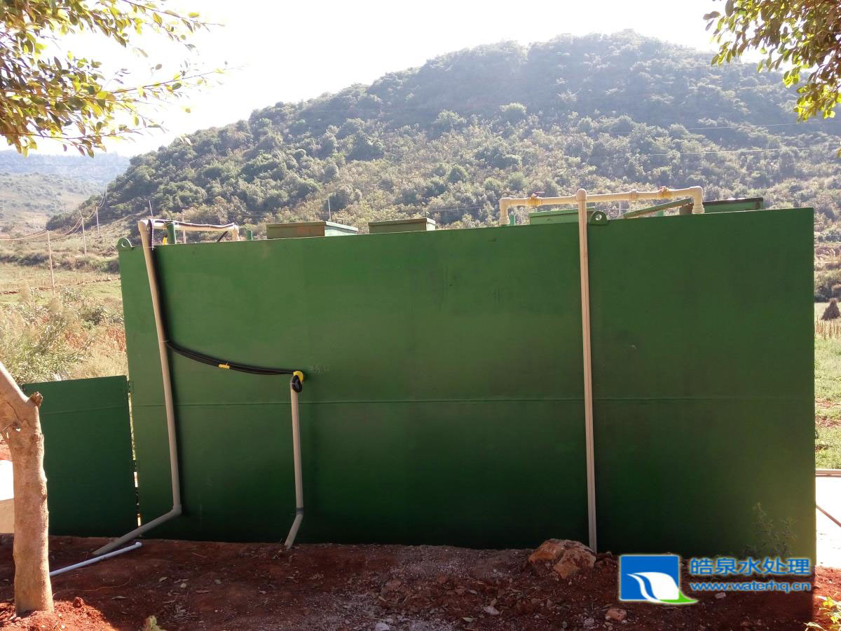 設(shè)備工藝為:污水經(jīng)化糞池熟化后,自流進(jìn)入污水處理站的格柵井,去除顆粒雜物后,流入調(diào)節(jié)池,進(jìn)行均質(zhì)均量,調(diào)節(jié)池中設(shè)置液位控制器,再經(jīng)液位控制儀傳遞信號,由污水泵送至厭氧生物反應(yīng)池,進(jìn)行酸化水解和硝化反硝化,降低有機(jī)物濃度,去除部分氨氮,然后自流至好氧生物反應(yīng)池進(jìn)行好氧生化反應(yīng),在好氧池絕大部分有機(jī)污染物通過生物氧化、吸附得以降解,出水自流至沉淀池進(jìn)行固液分離,沉淀池上清液流入清水池,在清水池內(nèi)投加次氯酸鈉溶液消毒后由清水泵送至蓄水池儲存,可以用于綠化用水或沖廁用水。